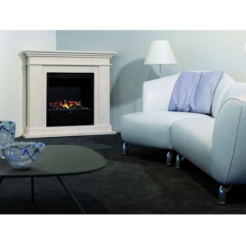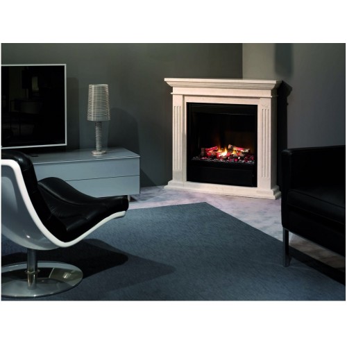 Der Elektrokamin Kos Corner stammt aus der Electric Fire Serie von Ruby Fires. Der Korpus des hochwertigen Elektrokamins ist wahlweise aus poliertem/unpoliertem Fossil Stone, einer echten Steinart, die wie Marmor aussieht oder aus lackierten MDF-Platten (Mitteldichte Holzfaserplatte) erhältlich. Bei der Ausführung in Fossil Stone ist der Stein auf einen robusten MDF-Kern geklebt, um das Gewicht des Kaminumbaus zu minimieren.